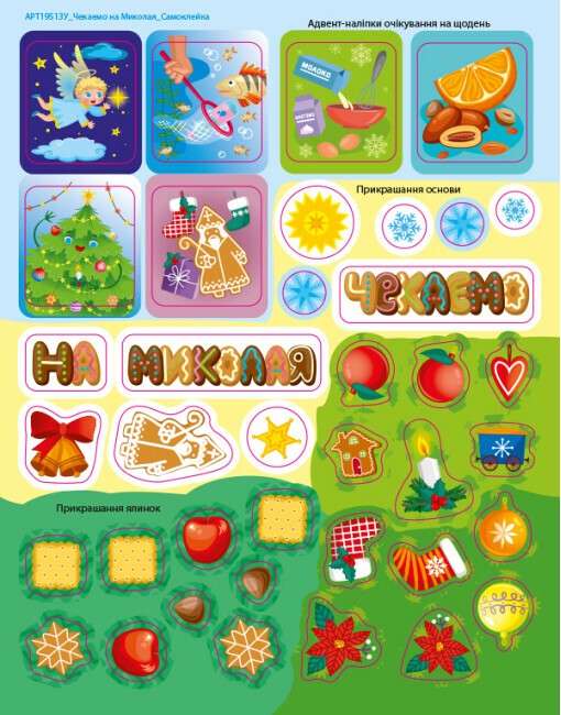 Адвент містить основу для складання адвенту, шаблони для прикрашання основи, наліпки та книжку добрих історій.