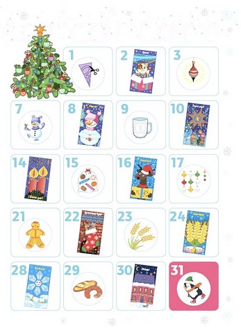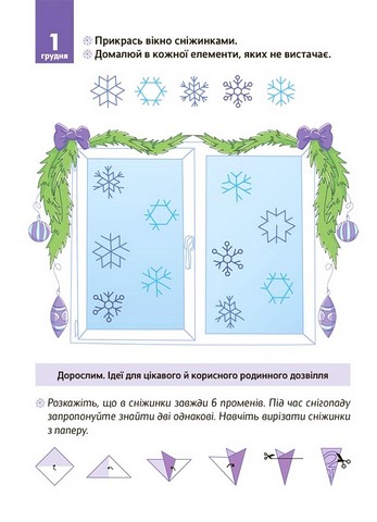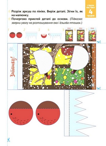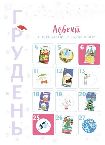 \nПеред вами — простір для творчості для дітей, побудований за принципом адвент-календаря. На його сторінках на дітей чекають 15 поробок та 15 завдань на кожен день очікування зимового свята. Кожна поробка перетворюється на листівку, яку потім можна скласти у святкову гірлянду для прикрашання оселі. Наш творчий адвент-календар допоможе організувати сумісне родинне дозвілля та перетворити очікування свят на справжню зимову пригоду!