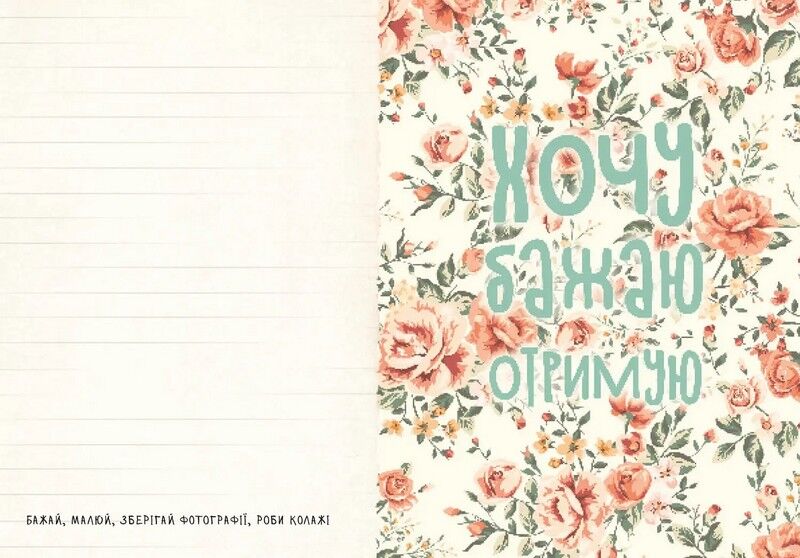 «Щоденник бажань» у сучасному стильному оформленні — красивий подарунок і чудовий помічник кожній дівчині. Що робить нас щасливими? — блокнот допоможе усвідомити свої бажання, сформулювати і зробити колажі-візуалізації своїх мрій. Він надихає мріяти і крокувати вперед до здійснення бажань.