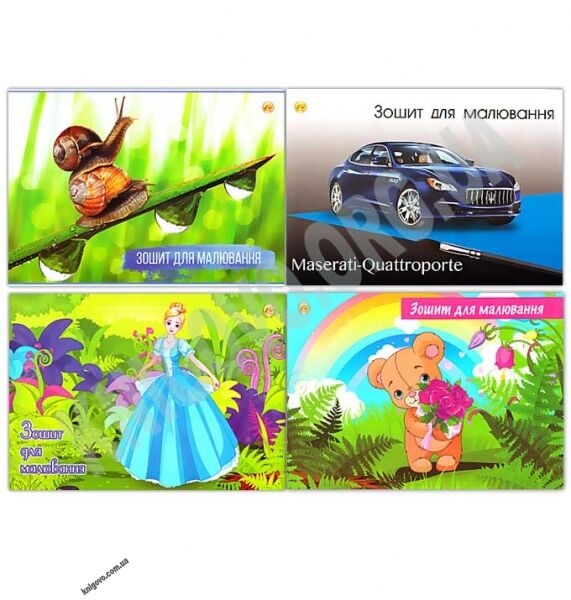 Зошити для малювання 12 аркушів на скобі Тетрада. 4 малюнка обкладинок: Равлики, Автомобіль Maserati Quattroporte, Попелюшка, Ведмедик з трояндами.