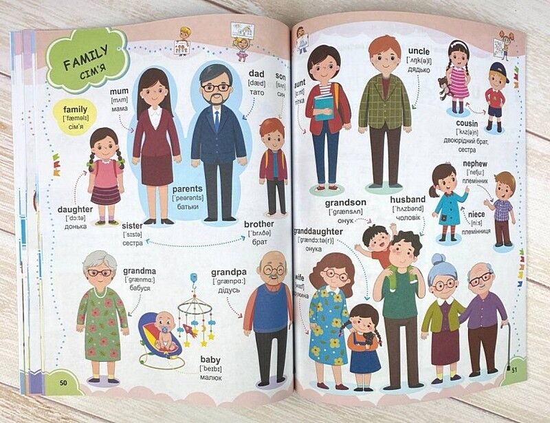- 12 тематичних розділів: Посібник охоплює широкий спектр тем, що цікаві для дошкільнят, такі як кольори, числа, тварини, їжа, сім'я та багато інших. Кожен розділ вивчається через цікаві та доступні для дітей матеріали.