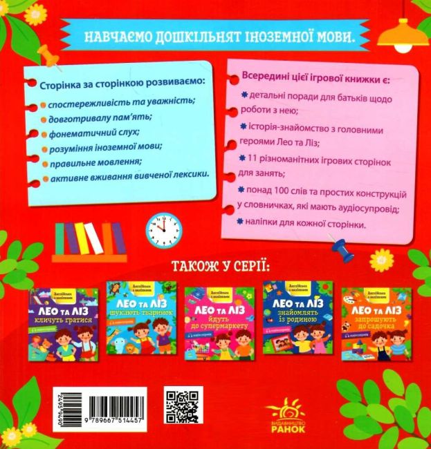 «Англійська з наліпками» — серія для першого знайомства з простою часто вживаною лексикою англійської мови з аудіосупроводом. У зошиті «Лео та Ліз досліджують дім», головні герої — веселі близнюки Лео та Ліз, запрошують дитину дослідити свій дім і навчають спілкуватися англійською. Різноманітні ігрові завдання, які тісно пов’язані з життям дітей, спонукають дошкільника до активного вживання англійської лексики. Книга містить також прості поради для батьків. Корисно для дітей 4-6 років.