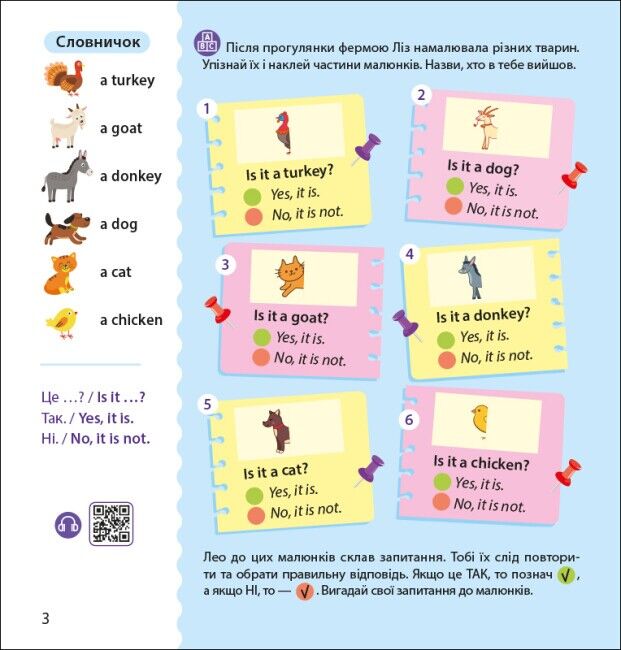 - Аудіосупровід: Книга супроводжується аудіоматеріалами, які допомагають дітям правильно вимовляти слова та фрази англійською мовою. Це забезпечує повноцінне занурення в мовне середовище та допомагає в освоєнні вимови.