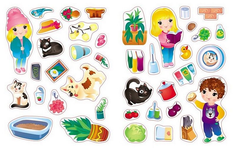 - 40 наліпок з зображеннями різних предметів та елементів, які можна зустріти в домашньому середовищі, таких як меблі, посуд, побутова техніка та інші.