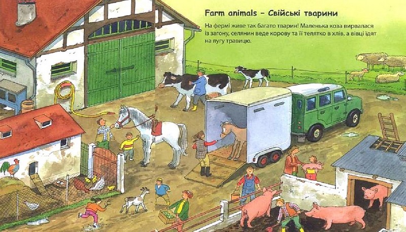 Гра – найкращий спосіб запам’ятати перші англійські слова! На фермі завжди багато роботи. Тварини чекають, коли їх погодують. Селянин їде на тракторі в поле, а селянка працює в городі. Добре, що вони мають добрих помічників!