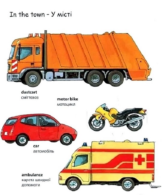 У місті завжди можна багато всього побачити. Мотоцикл стрімко завертає за ріг будинку. Великий автобус зупиняється, щоб пасажири могливийти й зайти. Сміттевоз сьогодні вивозить сміття.