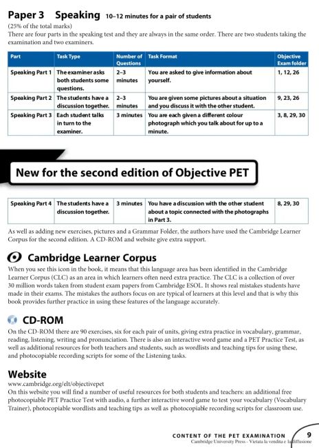 Objective PET Second edition is a completely updated and revised edition of the best-selling Objective PET course. This edition includes several great new features, including brand new 'Corpus spots' which alert students to common mistakes made by PET candidates. The Student's Book now includes a CD-ROM for extra language practice, including one complete printable PET practice test. The accompanying website includes an additional printable PET practice test. This Pack contains the Student's Book with CD-ROM and the PET for Schools Practice Test Booklet without answers. A Teacher's Book, Workbooks and a set of three Audio CDs are also available.