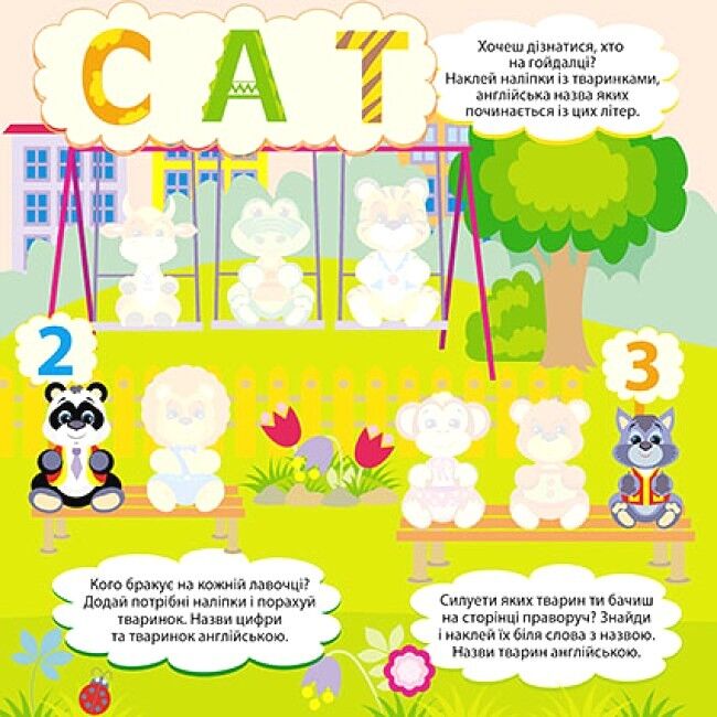 У цьому розмальовнику є 35 наліпок, які дозволяють дітям створювати власні сюжети та історії, розкладати слова та фрази, а також розвивати свою творчість та уяву. Наліпки можуть бути використані багато разів, що робить цей розмальовник веселим та пізнавальним інструментом для навчання англійської мови.