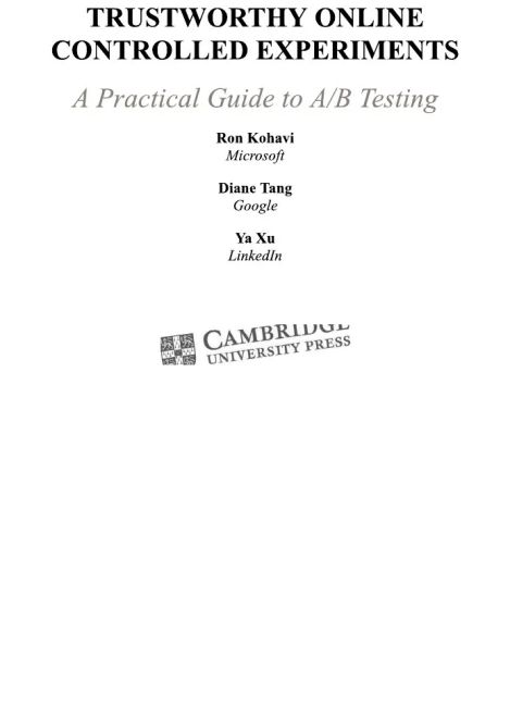 Trustworthy Online Controlled Experiments: A Practical Guide to A/B Testing 1st Edition, Ron Kohavi, Diane Tang, Ya Xu, Cambridge university press 97032