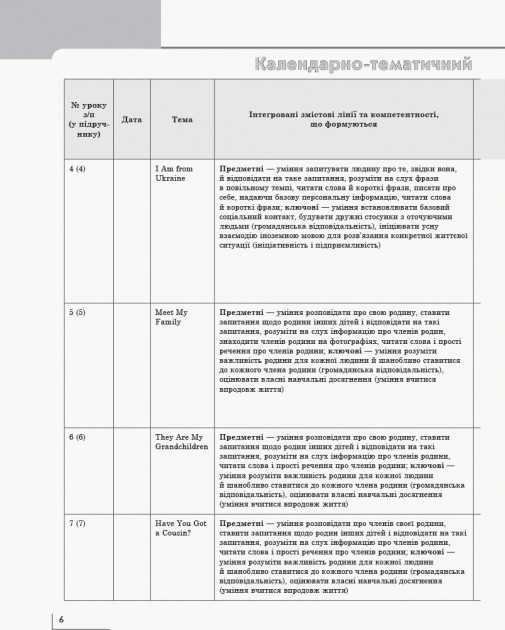 До кожного уроку подаються інтегровані змістові лінії та компетентності, що формуються. Посібник оформлений таким чином, щоб учителеві було зручно з ним працювати: у вигляді таблиці, де можна поставити дати за своїм розкладом.