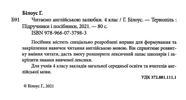 English reading with pleasure Читаємо англійською залюбки 4 клас НУШ Білоус Г. Підручники і посібники. Посібник містить спеціально розроблені вправи для формування та закріплення навичок читання англійською мовою.