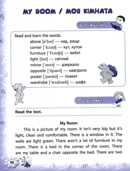 Тренажер з читання англійською мовою для 4 класу підготовлений за Новою програмою МОН України для початкової школи. Систематизований і поданий в оригінальному форматі матеріал курсу 4 класу дає змогу підготуватися до аудіювання, словникових диктантів, контрольних і самостійних робіт, поглибити знання, закріпити навички читання за допомогою вправ різних типів. Сучасне оформлення та наочна форма подання матеріалу роблять роботу з книгою легкою і зручною.