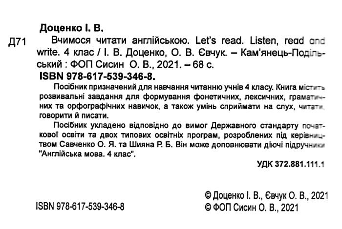 Вчимося читати англійською Listen read and write 4 клас НУШ Авт: Доценко І.В. Євчук О.В. Вид-во: Абетка 63642