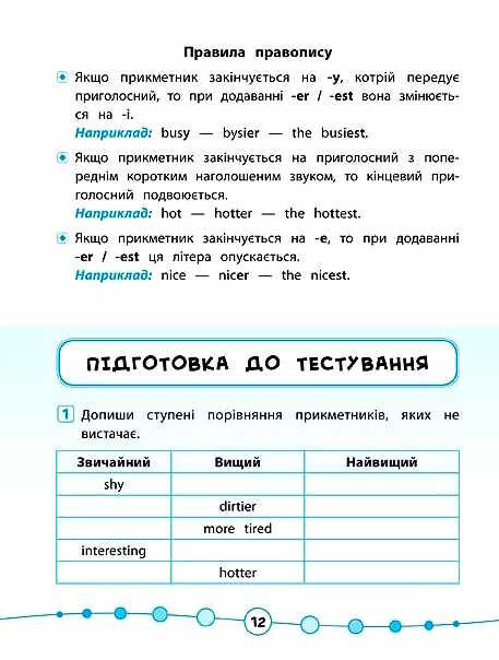 Книга Я відмінник Англійська мова Тести 4 клас допоможе учням четвертого класу успішно підготуватися до тестових підсумкових завдань з англійської мови в молодшій школі. У виданні міститься довідковий матеріал до кожної теми, підготовчі вправи завдання з відкритою формою відповіді та творчі завдання, а також тематичні тести.