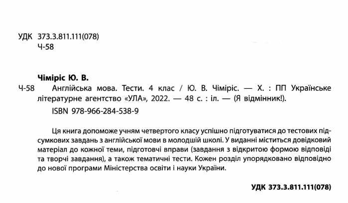 Я відмінник Англійська мова Тести 4 клас Чіміріс Ю. УЛА