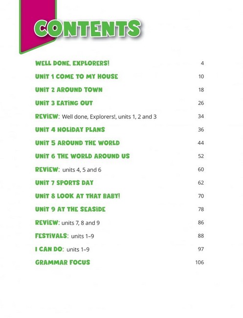 Розділи підручника структуровані за тематичним принципом, серед яких: Well done, Explorers!, Come to my house, Around town, Eating out, Holiday plans, Around the world, The world around us, Sports day, Look at that baby!, At the seaside.