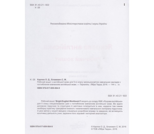 Робочий зошит Англійська мова 5 клас Нова програма Поглиблений Bright English 5 Workbook Авт: Карпюк О. Вид-во: Лібра Терра