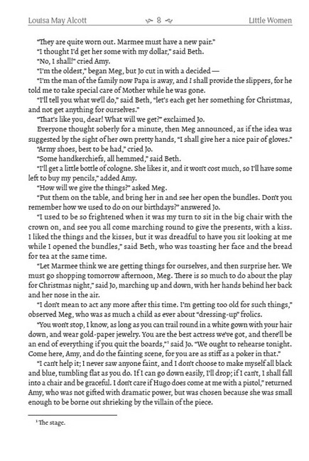 Little Women is a story that traces the lives of four sisters- gentle and agreeable Meg, straightforward and outspoken Joe, quiet and shy Beth, and dramatic and manipulative Amy. The novel shows the sisters’ life in Civil War New England and follows them as each of them matures and chooses her own life path. Originally created as a children’s novel, Little Women is a story that would be equally as interesting to an adult reader, as it is revolved around such themes as different versions of womanhood and a woman’s place in society.