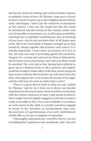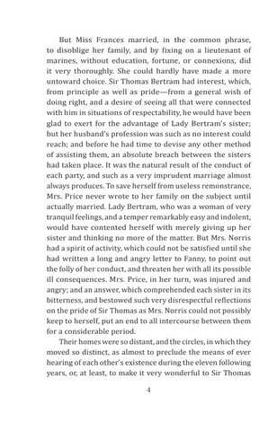 The novel «Mansfield Park», the third published novel of Jane Austen (1775–1817), belongs to the mature period of her work. The romantic plot of the novel is permeated with the irony of the author. The novel tells the story of Fanny Price from the moment when she, a ten-year-old girl, is sent by her poor parents to live with her rich aunt in the Mansfield Park estate. In the new family, the girl is gradually growing up. She faces selfishness and treachery, cupidity and misunderstanding. Thanks to her kindness and resilience, Fanny manages to find herself and find her happiness.