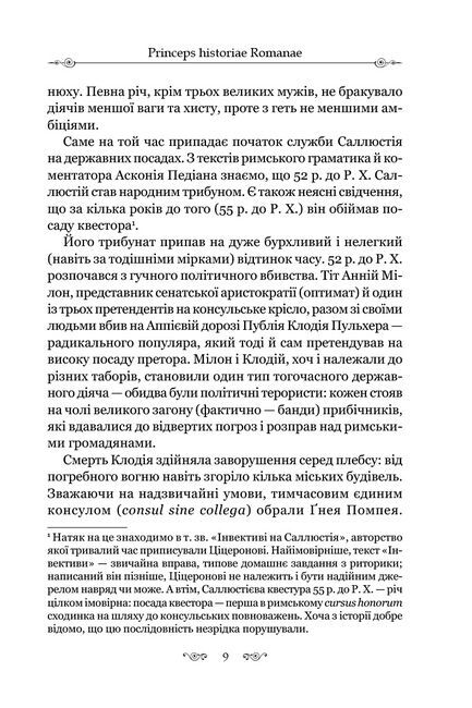 Ґай Саллюстій Крісп (бл. 86 р. до Р. Х. — бл. 35 р. до Р. Х.) — чільний римський історіограф, видатний стиліст, реформатор жанру. Тонкий психолог і майстер підозри, Саллюстій захоплював і надихав своїми творами не одне покоління європейських істориків, письменників та філософів — від Таціта до Момзена, від Сенеки до Ніцше. «Змова Катіліни» — дебютна монографія автора, присвячена подіям 63 р. до Р. Х., коли збіднілий патрицій Луцій Серґій Катіліна спробував учинити в Римі збройний переворот і захопити державну владу.