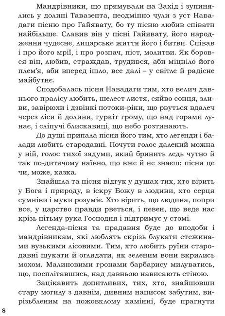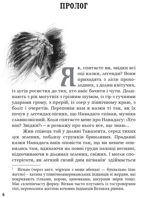 Що ви знаєте про індіанців? Хто вони такі? Яка історія виникнення цього народу, їхній розвиток, звичаї, традиції? Чи насправді вони розуміли мову звірів, птахів та загалом довкілля? Чим вони різнились з-поміж інших людей? На прикладі героя цієї книги Гайявати ви можете пізнати незвичайне життя індіанців, основні риси характеру – любов до рідного краю, відвагу, мужність, готовність прийти на допомогу іншим, а водночас – щиросердність, привітність, уміння і радіти, і кохати, і співати, і пробачати... Дізнаєтесь про легендарні пригоди вождя Гайявати, який, можливо, навчить вас дивитися на світ іншими очима, ніж донині, а також бути готовими захищати те, що дороге вашому серцю, по-справжньому, віддано дружити і любити.