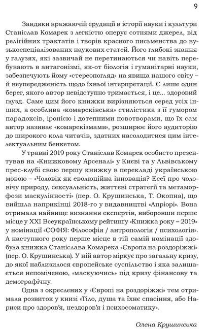 Це третя книжка відомого чеського інтелектуала Станіслава Комарека, що виходить в українському перекладі. Дві попередні, «Чоловік як еволюційна інновація?» і «Європа на роздоріжжі», не лише підкорили українських читачів, а й отримали визнання експертів, здобувши дві перемоги поспіль у Всеукраїнському рейтинґу «Книжка року» в номінації «СОФІЯ: Філософія / антропологія / психологія» (2019, 2020). У книзі «Тіло, душа та їхнє спасіння...», що витримала у Чехії вже два видання, розглянуто питання взаємозв’язку між тілесним і психічним, здоров’ям і хворобою, життям і смертю, які бентежать кожного з нас, а також історію й засади психосоматичної медицини. Крім цього, автор розвиває одну із тем, окреслених у «Європі на роздоріжжі». Небачений раніше добробут поєднується з найменшою за всю історію народжуваністю та найбільшим страхом за своє життя. У піклувальній державі, яка виховує інфантильних і слухняних громадян, медично-промисловий комплекс перебрав на себе ту саму роль, що і церква в минулому...