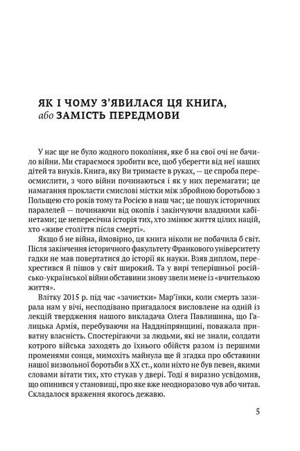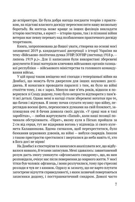 З-поміж значної кількості літератури про Західно-Українську Народну Республіку ця книга є унікальною. Адже вона поєднала наукове дослідження історії Галицької Армії та особистий досвід автора, здобутий під час сьогоднішньої російсько-української війни на Донбасі. Михайло Галущак проводить численні історичні паралелі у війні з Польщею століття тому й сучасною війною з Росією. Основою праці стала захищена кандидатська дисертація на тему «Військово-політична думка ЗУНР/ ЗОУНР (листопад 1918 р. – липень 1919 р.)». Проаналізовано питання розбудови збройних сил, розподілу повноважень ключових органів державного керівництва та військового командування. Розглянуто найважливіші воєнні операції армії галицької республіки – і ті, які були втілені, й ті, яким судилося залишитись у планах. Окреслено альтернативні варіанти перебігу польсько-української війни 1918–1919 рр., вплив внутрішніх та зовнішніх чинників на еволюцію стратегії збройної боротьби. Автор уперше в історіографії обґрунтував доцільність використання терміна «Українське Військо» щодо збройних сил ЗУНР. Для широкого загалу читачів і всіх, хто цікавиться історією.