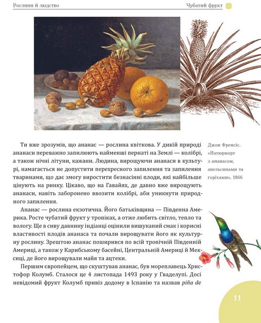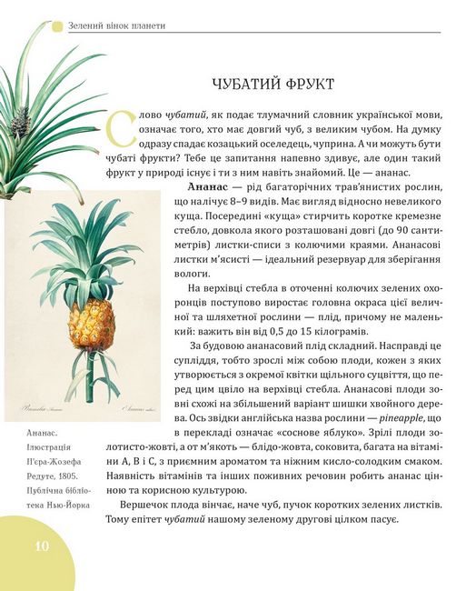 У якого фрукта є чуб, за яку квітку в XVII столітті готові були віддати все майно, які квіти смердять мертвечиною, який листок витримає на собі людину, у якої рослини найбільша насінина, які дерева сягають більше 100 метрів заввишки, яка рослина не любить дотиків — про ці та інші дивовижні факти рослинного світу ти дізнаєшся на сторінках цієї книги.