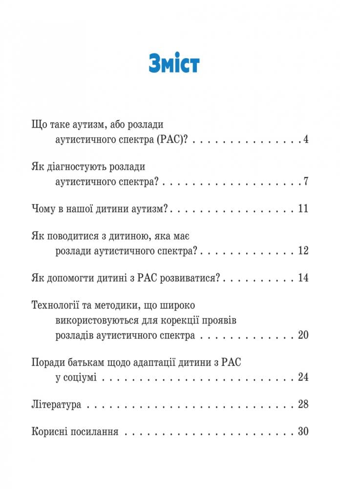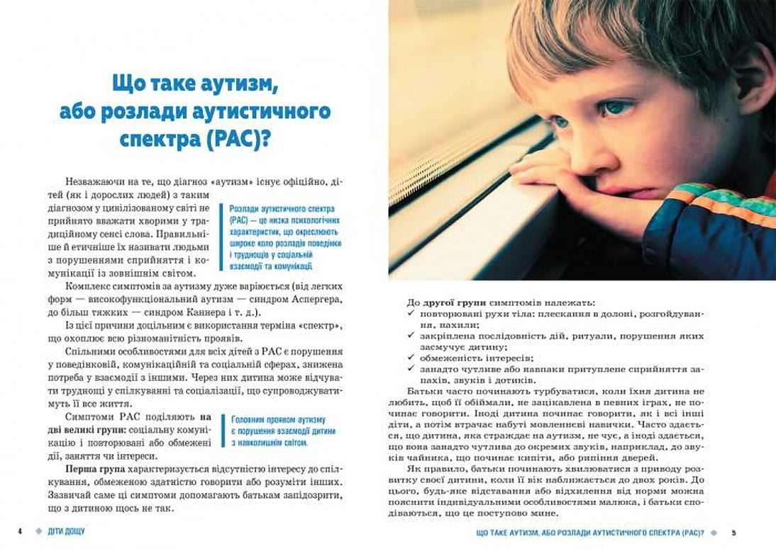 Книжка містить методичні рекомендації й корисні поради батькам, які виховують дітей з розладами аутистичного спектра. Автори надають важливу інформацію про аутизм, розповідають про особливості розвитку особливої дитини, її можливості, сучасні методи та технології навчання та виховання.