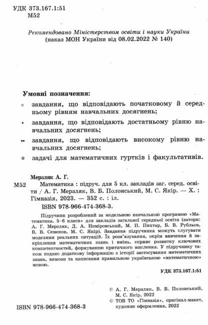 Підручник Математика 5 клас НУШ Авт: А. Г. Мерзляк В. Б. Полонський М. С. Якір Вид-во: Гімназія 86565