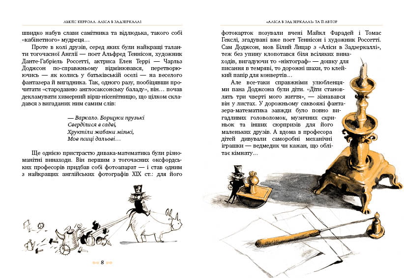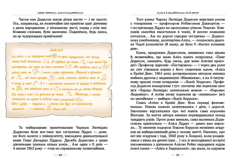 Нові пригоди улюбленої героїні — не менш захопливі, ніж уже відомі. Задзеркалля — незвичайна країна. «Ніби велетенська шахівниця», — каже про неї Аліса. І кожен хід у цій грі і справді вражаюча несподіванка, про що дізнається читач, гортаючи сторінки цієї дивовижної казкової повісті...