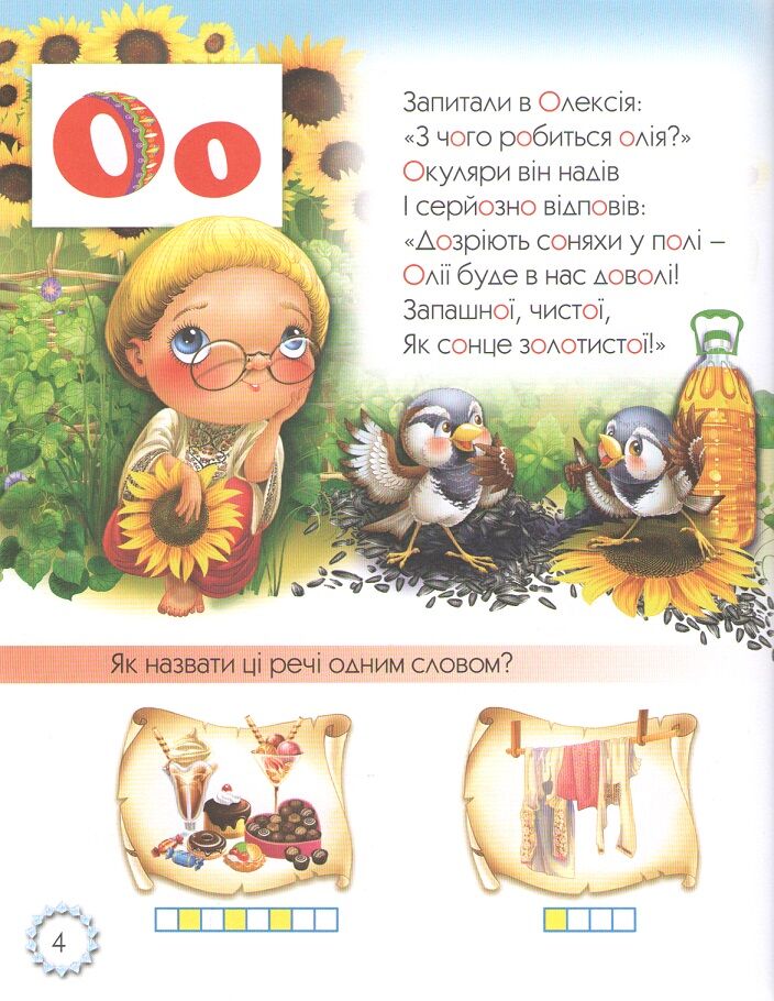 Букварик містить прості та зрозумілі завдання, спрямовані на ознайомлення з літерами, їх звуковим значенням та формуванням перших словесних навичок. Такий підхід дозволяє дітям легко вивчати алфавіт і початкові звуки мови.
