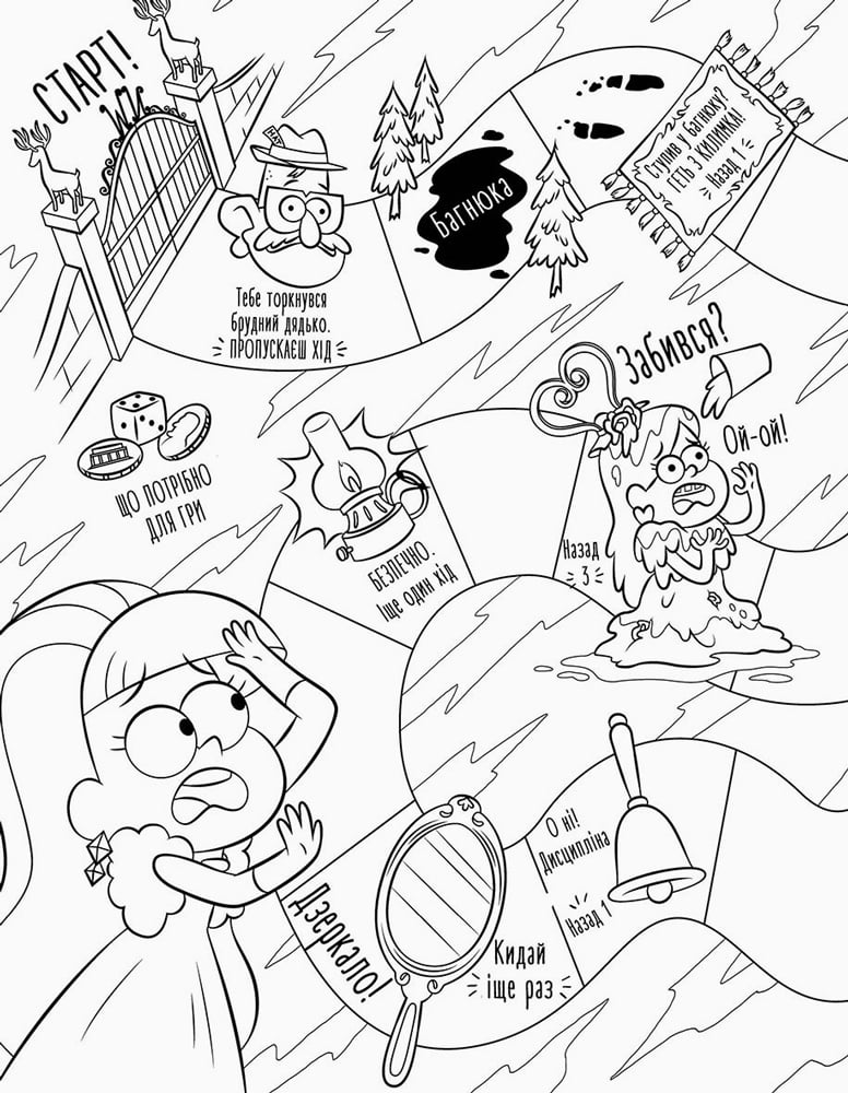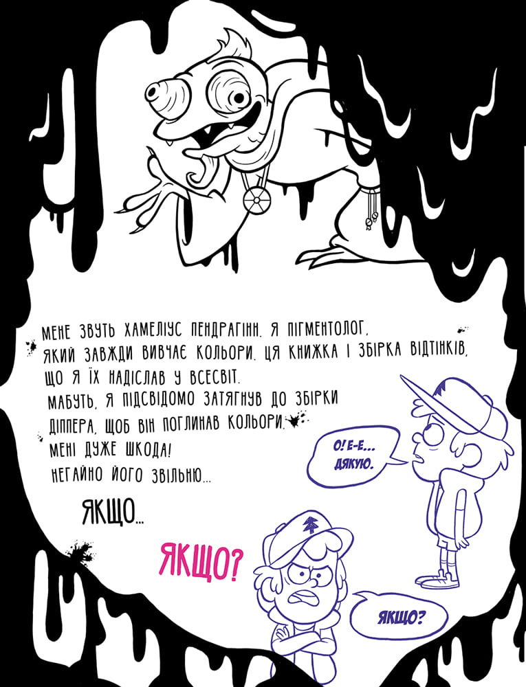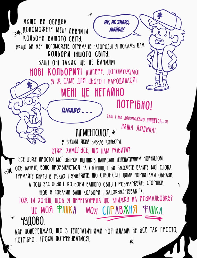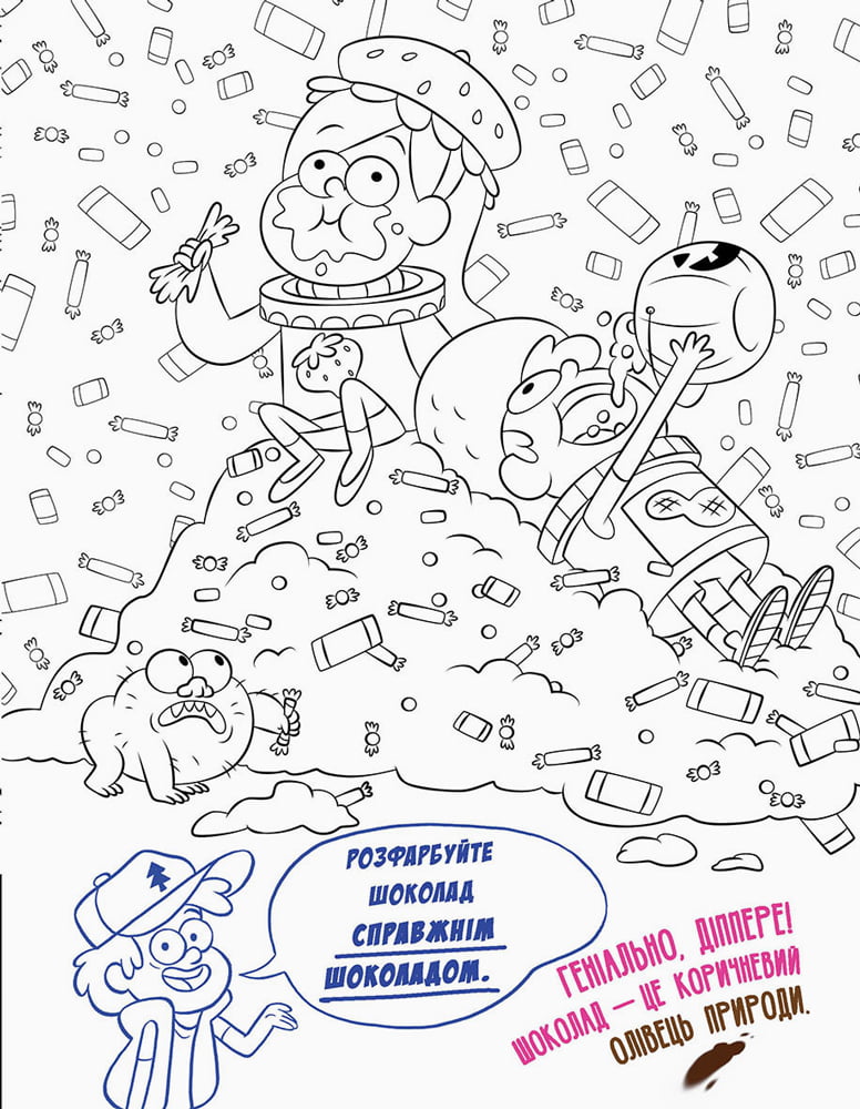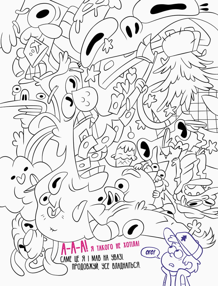Тут нема чого дивитись! Просто звичайнісінька, кумедна, нормальна така розмальовка. Нічого магічного чи надзвичайного не станеться, якщо ти її розфарбуєш! І точно вже ніяких небажаних наслідків розфарбовування сторінок не буде! У пастку ти не потрапиш, ніхто тобою не маніпулюватиме, ніхто тебе не дуритиме! Аж ніяк! Правда, один хлопчик – Діппер Пайнз – застряг у... книжці. Взагалі, ця книжка – погані новини... Дивись, нізащо її не розфарбовуй!