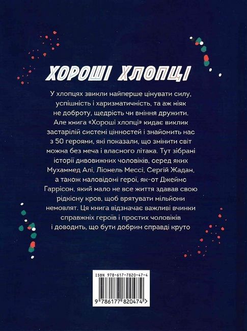 У хлопцях звикли наи?перше цінувати силу, успішність і харизматичність, та аж ніяк не доброту, щедрість чи вміння дружити. Книжка «Хороші хлопці» кидає виклик застаріліи? системі цінностеи? і знаи?омить нас з 50 героями, які показали, що змінити світ можна без меча і власного літака. Тут зібрані історіі? дивовижних чоловіків, серед яких Мухаммед Алі, Ліонель Мессі, Сергіи? Жадан, а також маловідомі героі?, як-от Джеи?мс Гаррісон, якии? мало не все життя здавав свою рідкісну кров, щоб врятувати мільи?они немовлят. У виданні автор розповідає про важливі вчинки справжніх героїв і простих чоловіків і доводить, що бути добрим справді круто. Над розворотами про Миколу Пирогова, Антона Макаренка, В'ячеслава Чорновола, Сергія Жадана і Валентина Фречку працювали: автор текстів Юріи? Марченко, ілюстраторка Дар’я Федоринська.