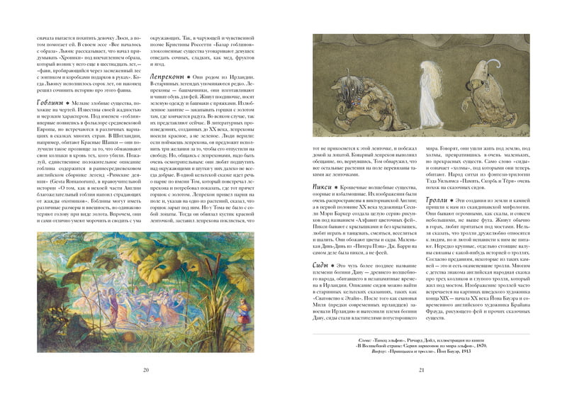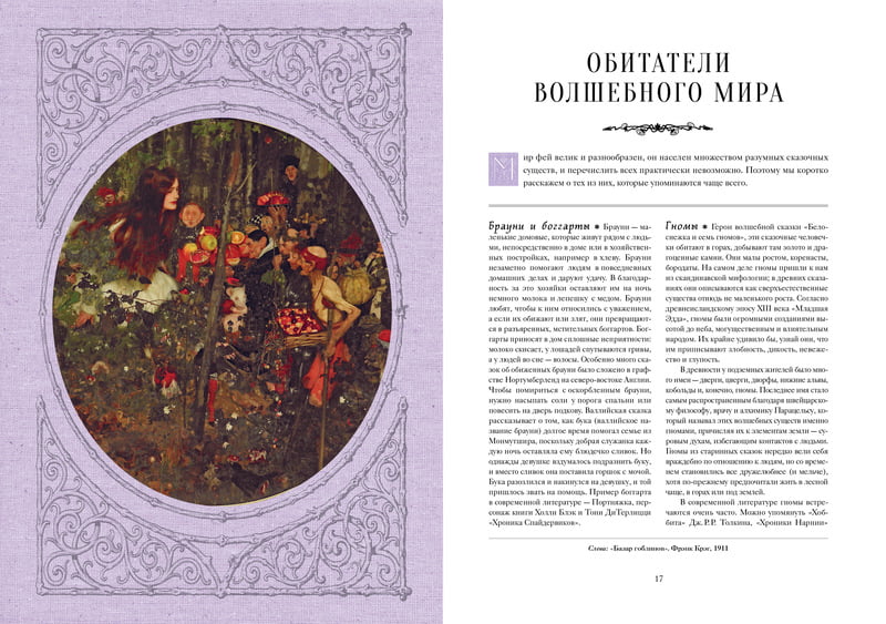 В издании представлена уникальная коллекция великолепных текстов и потрясающих иллюстраций: среди них работы Г. Доре, Дж. У. Уотерхауса, И. Г. Фюссли, Ж. Ж. Гранвиля, Р. Дадда, Дж. А. Фицджеральда, А. Рэкхема, А. Ли, Ч. Весса – неисчерпаемый источник вдохновения для творческих личностей. Вы побываете в Волшебной стране, познакомитесь с ее таинственными обитателями, их нравами и привычками, узнаете о том, как нужно вести себя в этом загадочном мире, как сшить платье для феи и смастерить для нее мебель, собрать растения, обладающие целебной силой, приготовить изысканное эльфийское угощение и устроить феерический праздник.