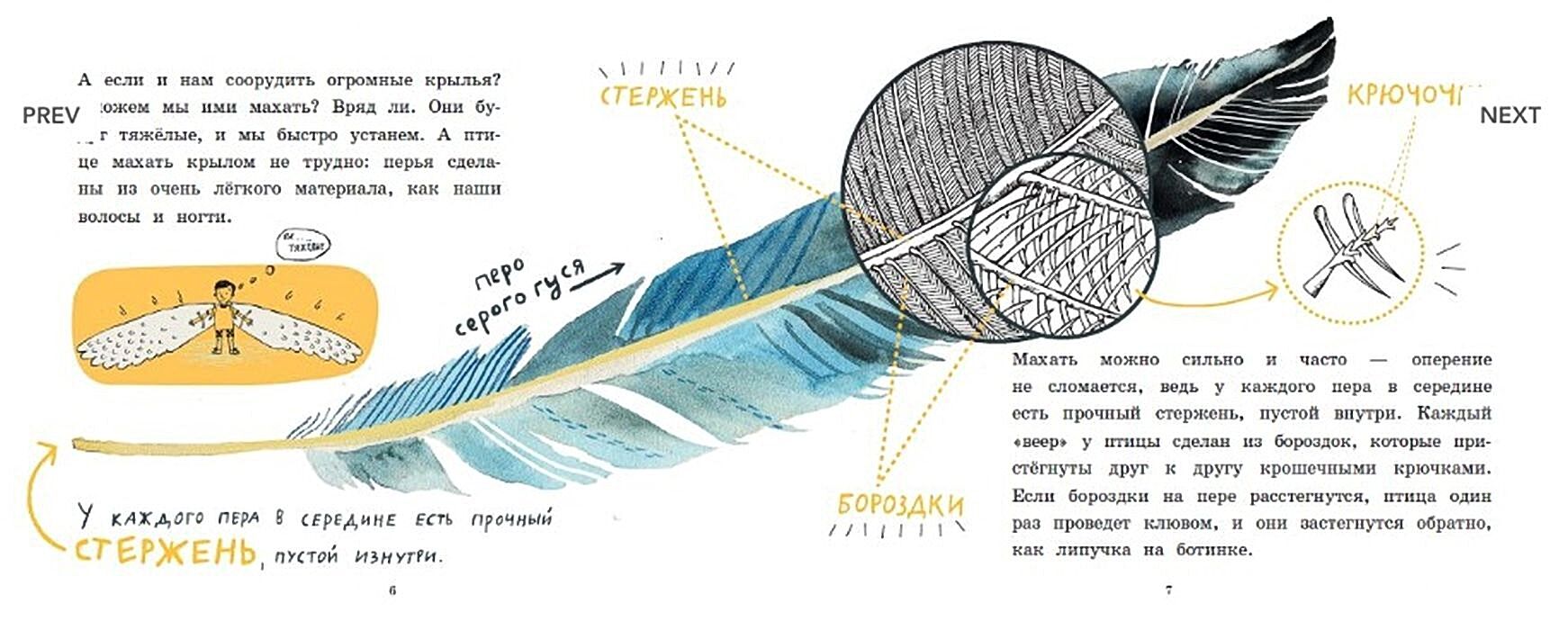 Уже из названия понятно, что, во-первых, родилась она из детского вопроса, а во-вторых, отвечает на него точно, увлекательно и весело. Шаг за шагом Илья Колмановский объясняет, как устроены крыло, перо, клюв, голова и как вся птица, в целом, приспособлена для полета.