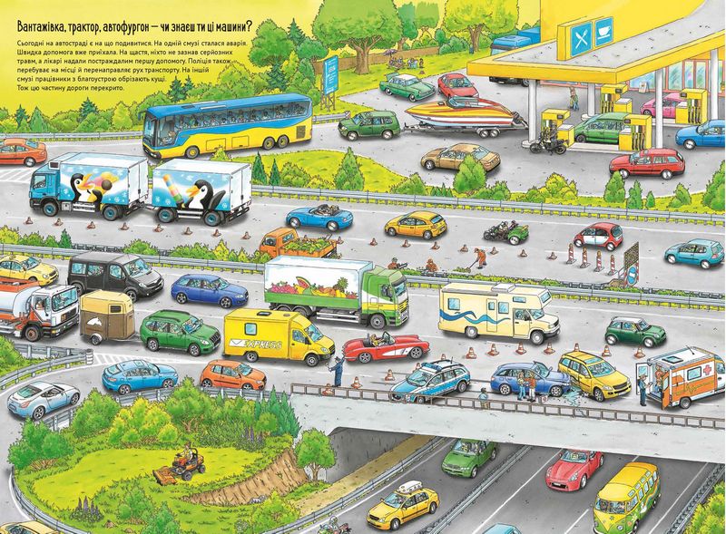 Ця велика яскрава книжка є найкращим подарунком для малюків, які обожнюють машини. Маленькі читачі проїдуться автобаном, побувають на будівельному майданчику, зберуть урожай і допоможуть рятувальникам. Деталізовані зображення найцікавіших автомобілів привернуть увагу найвибагливіших любителів техніки.