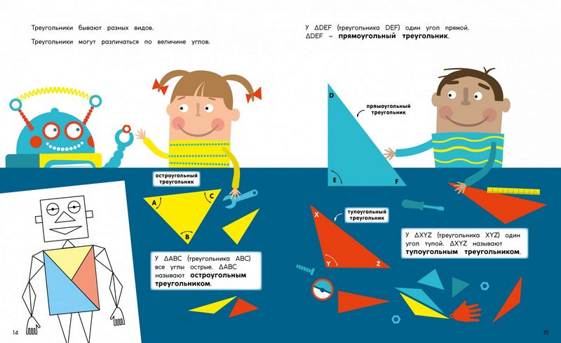 Эта книга о треугольниках. Ваш ребёнок познакомится с разными видами треугольников и научится измерять углы. Все примеры в книге сопровождаются занимательными упражнениями, которые помогут усвоить материал.