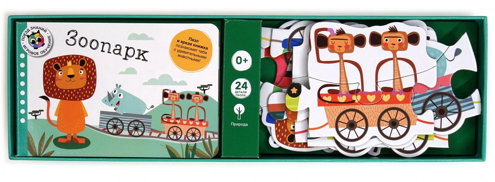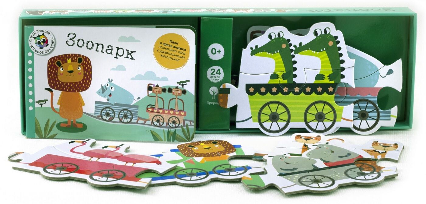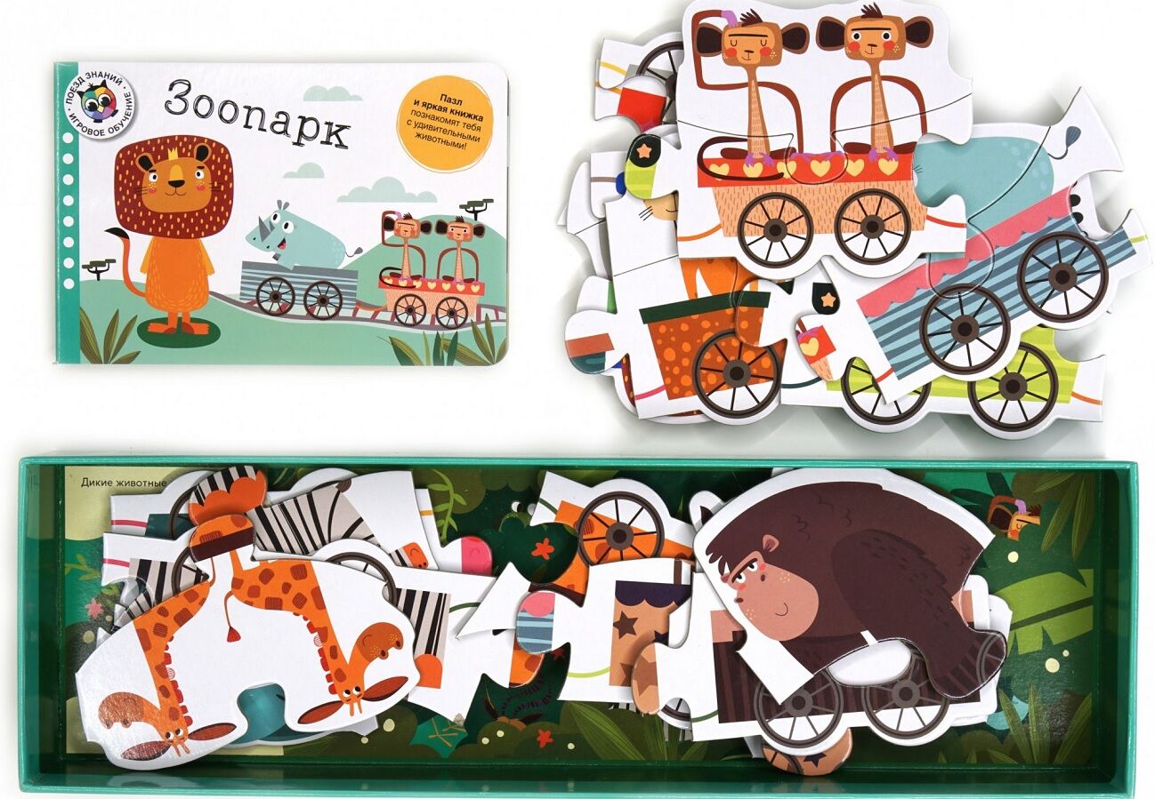 Набор предлагает бесконечные возможности для игры и обучения. Собирая пазл и рассматривая книгу, ребёнок познакомится с самыми интересными животными, которых он сможет увидеть в зоопарке.