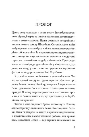 Кожне любляче серце знаходить собі пару завдяки пантеону давніх богів. З першим весняним промінням починається Шлюбний Сезон, за час якого боги намагаються об’єднати людей та допомогти їм знайти одне одного. Лише Лель вже тисячі років ставить собі за мету закохати у себе саме ту панянку, яка зарікається впустити у своє серце любов. Ця повість про життя звичайної підлітки Кіри, яка захоплюється фотографією, обожнює секонд-хенди та барахолки, а також занурена у творче життя з літературними квартирниками та вечорницями. У цій історії ми побачимо, як стикаються два світи – патріархальний, давній, просочений традиціями та усталеними порядками; а також сучасний – вільний, рівноправний та незалежний. У намаганні добитися уваги Кіри Лель буде потрапляти у різні кумедні ситуації: потовчеться у черзі на завозі в секонд-хенді, віднайде унікальний скарб серед барахолки на Почайній, долучиться до когорти талановитої молоді та постане перед складною дилемою – лишатися богом та відпускати Кіру, віддавши ключ від її серця іншому? Чи бути людиною, позбувшись здатності обертатися на сонячне проміння, стати смертним?
