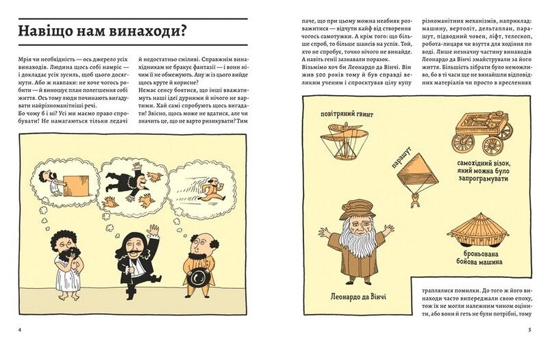 Коли на зламі XV і XVI століть Леонардо да Вінчі вигадав танк, автомобіль, вертоліт, дельтаплан, парашут, підводний човен, ліфт і телескоп, його, очевидно, вважали за мрійника. Або навіть шаленця. Нині кажуть, що він — геній, який випередив свій час... Неймовірний огляд давніх і сучасних винаходів — новаторських, переломних, кумедних, невдалих чи навіть нездійсненних. Але вони всі про людську фантазію.