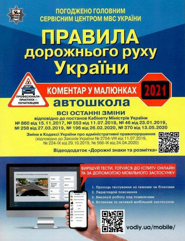 Правила дорожнього руху України Автошкола коментар у малюнках 2021 УкрСпецВидав. Посібник містить детальні ілюстровані пояснення до чинних Правил дорожнього руху України (зі змінами і доповненнями, затвердженими постановами Кабінету Міністрів України), які допоможуть краще засвоїти матеріал і ефективно застосовувати його на практиці.