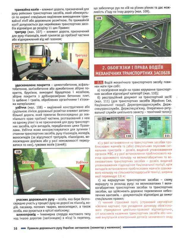 Органічна єдність офіційного тексту ПДР і коментарів у малюнках полегшить вивчення ПДР, що своєю чергою дозволить водію краще орієнтуватися в реальних дорожніх ситуаціях, швидко і правильно приймати рішення. Видання доповнено необхідними для водіїв додатками: «Дорожні знаки», «Дорожня розмітка» (коментар у малюнках), «Сигнали регулювальника» (пояснення), «Дії водія при ДТП (алгоритм)», «Відповідальність за порушення та злочини у сфері безпеки дорожнього руху (нові штрафи)», «Основи автотранспортного права».