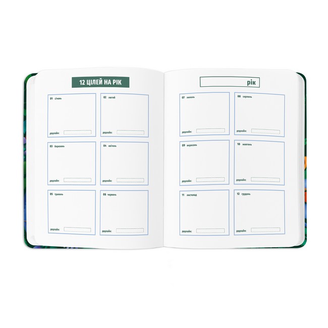 - Дополнительные развороты: план целей на год, доска желаний, вишлисты, трекер привычек, пустые линованные страницы для записей, разворот итогов года