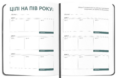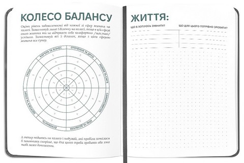 Має вставки із цілями на рік, контролем водного балансу, колесом балансом, звичками