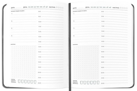 У цьому планері на жаль дуже мало місця для запису щоденних, рутинних задач, про які не хочется забувати. На кожен день відведено місце для 4 основних справ на день по 3 строчки та розпис дня по годинам з 8 ранку до 22 вечора. Маленький блок для нотаток. Тобто, записати нормально пояснення якоїсь задачі буде важко, бо на всі такі задачі місця банально не вистачить. Проте, як рішення може бути, що один день можна розділити на два аркуші, бо планер не датований. Однак це не зручно. Задумка 10 із 10, реалізація 7 із 10 :)