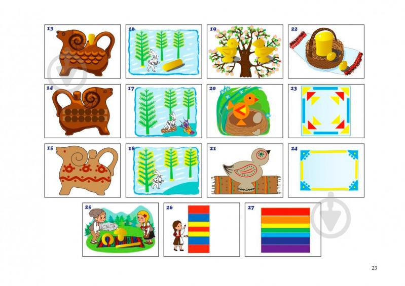 Пропонований альбом-посібник створено з метою ознайомлення дітей дошкільного віку з кращими надбаннями українського народного декоративного мистецтва — складової частини національного виховання. Альбом-посібник відповідає Базовому компоненту дошкільної освіти (освітня лінія «Дитина у світі культури»), Програмі виховання і навчання дітей від двох до семи років «Дитина» (розділ «Наші малята», підрозділ «Чарівні фарби та талановиті пальчики» та ін.), а також начально-методичному збірнику «Розуму і серцю маленької дитини — народне мистецтво рідної України» (автор Уманська О.М.). Використання альбому-посібника допоможе вихователям дошкільних навчальних закладів зреалізувати освітні завдання рубрики «У родинному колі» (третє видання програми «Дитина»), переорієнтуватись з репродуктивних на продуктивні методи організації колективної та індивідуальної зображувальної діяльності дітей, а також сприятиме сумісній діяльності батьків і дітей з ліплення, аплікації, малювання удома, створенню власного дитячого альбому- результату-радості. Подані в альбомі зразки художниці Євгенії Рудюк справлять на дітей яскраві враження, вплинуть на активне розв’язання малятами запропонованих завдань різноманітними художніми засобами. Для дітей молодшого дошкільного віку, їх батьків, вихователів ДНЗ.