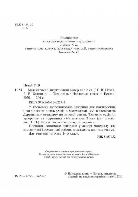 Дидактичний матеріал Математика 2 клас НУШ До підручника Н.П. Листопад Авт: Г.В. Нечай Л.В. Онишків Вид-во: Богдан 83116