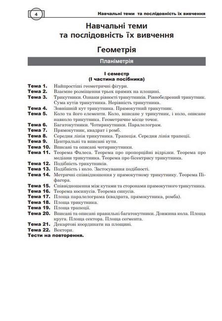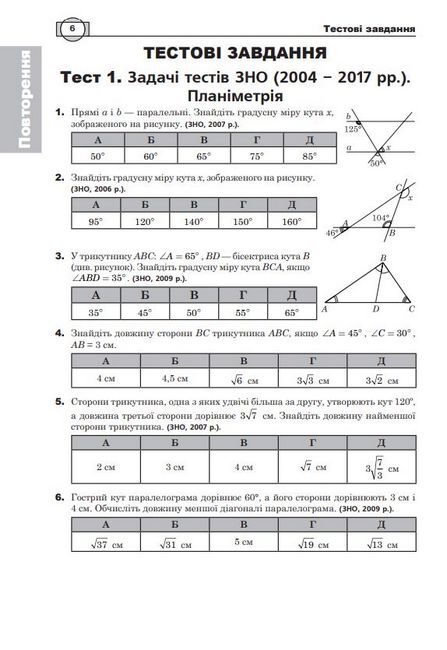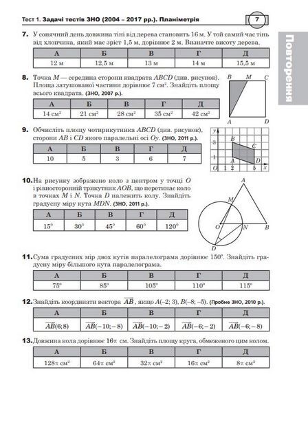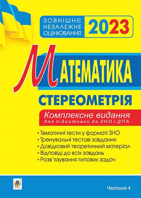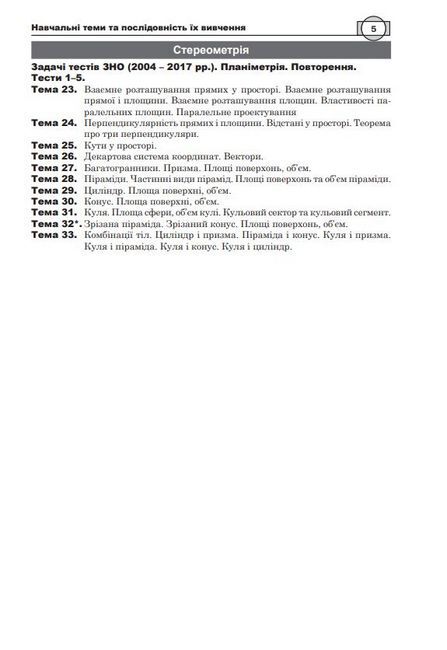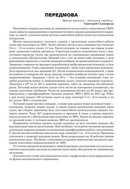Метою пропонованого навчального посібника є організація самостійної роботи учнів при підготовці до зовнішнього незалежного оцінювання (ЗНО). Тестові завдання охоплюють увесь курс стереометрії, тобто геометрії 10-го – 11-го класів. Тести укладені у двох рівноцінних варіантах по 30 завдань у кожному варіанті. До всіх завдань тестів є відповіді. Усі тестові завдання відповідають чинній програмі з геометрії для загальноосвітніх навчальних закладів та вимогам щодо написання сертифікаційної роботи ЗНО. Структура кожної з тем є аналогічною структурі тестів, пропонованих на зовнішньому оцінюванні. До посібника додається довідник, у якому роз’яснена теорія кожної з тем та запропоновано розв’язання типових задач. Для вчителів та учнів загальноосвітніх шкіл та профільних класів природничого та фізико-математичного спрямувань.