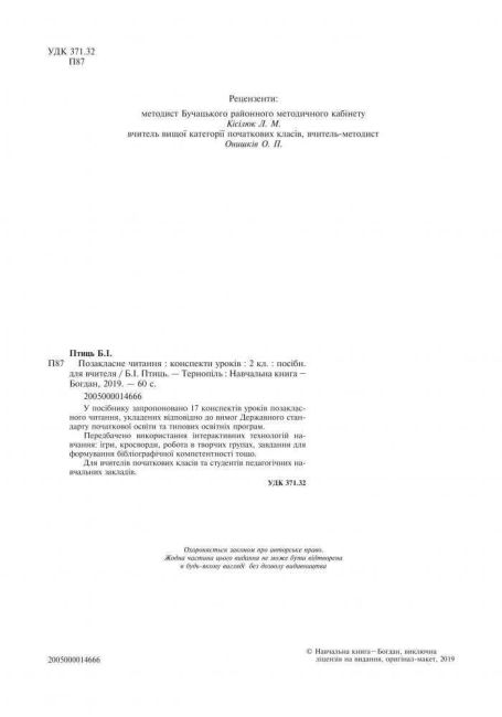 Конспекти уроків Позакласне читання 2 клас НУШ Авт: Птиць Б.І. Вид-во: Богдан 83205